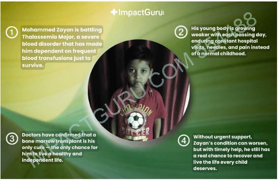 Zaya, my brave little boy, has been fighting a relentless condition that brings him immense pain from blood transfusions. His only hope for a healthier future is a bone marrow transplant, but the cost runs into lakhs.